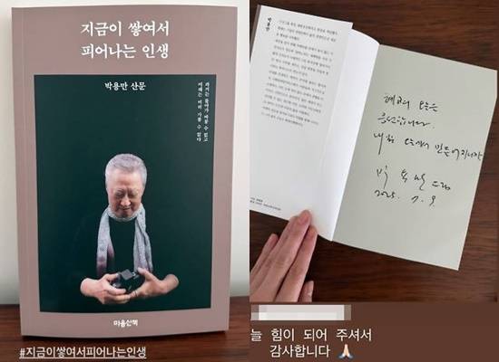 공개된 사진 속에는 박용만 전 두산그룹 회장이 쓴 산문집 '지금이 쌓여서 피어나는 인생' 표지와 함께 박 전 회장이 첫 장에 "혜교의 오늘을 응원합니다. 내일은 오늘에서 만들어지니까"라고 적은 친필 메시지가 담겨 있다.