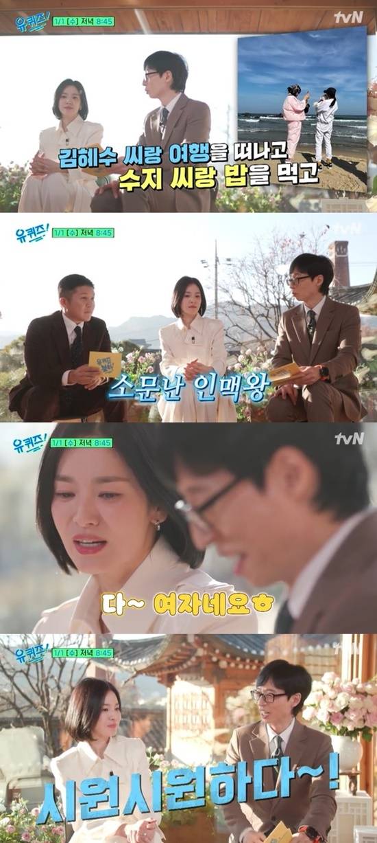 지난 1월 주연작 영화 '검은 수녀들' 개봉과 함께 tvN 예능 '유 퀴즈 온 더 블럭'에 출연하며 23년 만에 토크 예능에 나섰던 송혜교는 다양한 인맥 언급에 "다 여자네요"라고 유쾌하게 받아치며 유재석을 폭소케 만들기도 했다.