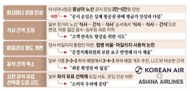 아시아나항공이 운임 인상에 나서고, 대한항공이 기내 서비스 꼼수를 부리는 등 지난해 12월 양사 합병 이후 소비자 편익을 훼손하는 행위가 빈번해지고 있다.