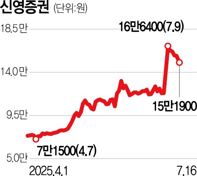 업계에서는 상법 개정안 통과와 배당소득 분리 과세 도입 기대감이 맞물리면서 자사주 비중이 높거나 저평가된 일부 증권주의 오름세가 두드러졌다고 분석했다. 신영증권의 자사주 비중은 53%로 대표적인 ‘상법 개정 수혜주’ 중 하나로 꼽힌다. 유진투자증권은 자사주 비중(5%)이 눈에 띄게 높지 않아 관련 효과는 제한적일 수 있지만 주가순자산비율(PBR)은 0.36배에 그쳐 저평가주로 평가된다. 신영증권 역시 PBR이 1배에 못미친 0.69배다.
