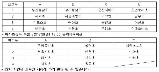 - A조: 부산성남초, 사화초, 더모스트, 비봉초