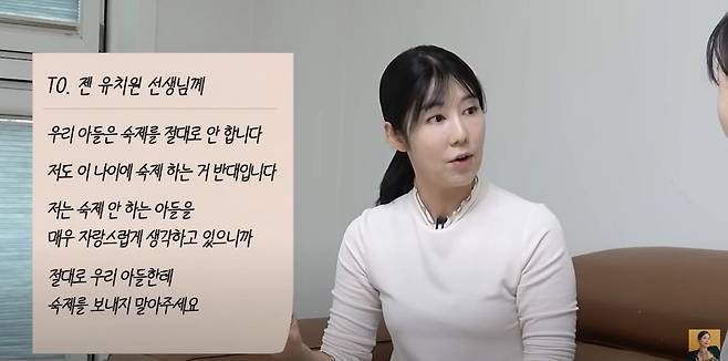 편지에는 "나는 숙제를 하지 않는 아들이 자랑스럽다. 그러니 우리 아이에게는 숙제를 내지 말아달라"는 내용이 담겨 있었다. 사유리는 "숙제가 아이의 호기심을 떨어뜨리고 흥미를 잃게 만들 수 있다"며 "자발적으로 배우게 하는 것이 더 중요하다고 생각한다"고 강조했다.