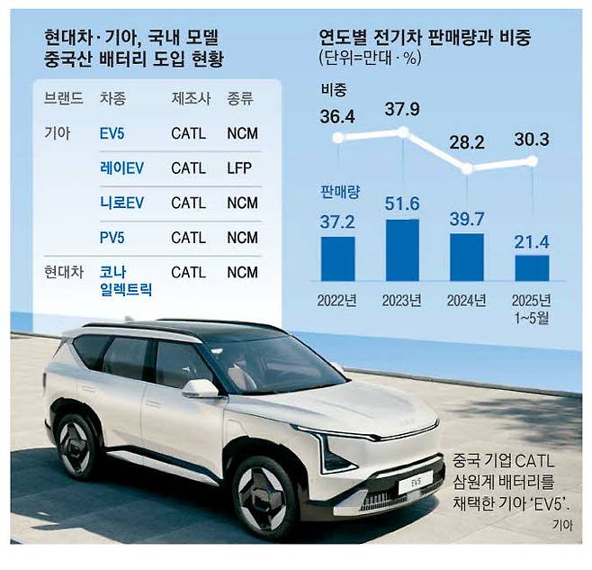 기아가 EV5에 중국산 삼원계 배터리를 채택한 것은 준중형 스포츠유틸리티차량(SUV) 모델에 처음으로 중국산 배터리를 적용했다는 점에서 업계에 시사하는 바가 크다.
