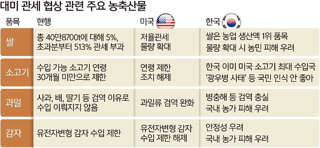 미국이 개방을 요구하는 대표적인 농축산물은 쌀과 소고기다. 트럼프 대통령은 지난달 30일(현지시간) 사회관계망서비스(SNS) 트루스소셜에 “일본은 대량의 쌀 부족을 겪고 있는데도 우리의 쌀을 수입하지 않으려고 한다”며 일본을 공개 압박했을 정도로 쌀 시장 개방에 무게를 두는 모습이다. 현재 미국산 쌀에 대한 쿼터제(13만2304t까지 관세율 5%, 초과 땐 513%)가 발효된 상태인 한국도 예외가 되긴 어려워 보인다. 아울러 쌀 가격이 하락하거나 공급과잉이면 정부가 초과분을 의무적으로 매입하는 내용의 ‘양곡관리법 개정안’은 정부의 쌀 수입 규제 완화 검토의 명분이 될 수도 있다.