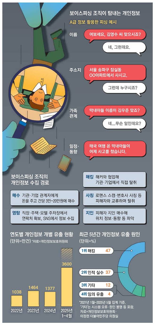 조직화된 보이스피싱 단체는 개인정보를 구입하거나 본인들이 고용한 해커를 통해 직접 개인정보를 해킹해 예비 피해자들의 정보를 획득하기도 한다. 이름, 전화번호와 같은 간단한 정보는 1개당 3원에 500만~1000만개씩 사들이고, 피해자에게 뜯어낼 수 있는 금액을 가늠하게 하는 신용등급, 오픈뱅킹, 협박 수단이 되는 인간관계와 같은 고급 정보는 20만원에도 거래된다는 게 이 소장의 이야기다.