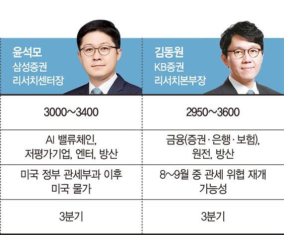NH투자증권 조수홍 리서치센터장은 "미국 OBBB 법안 통과 효과와 연준 금리 인하 기대감이 우호적으로 작용할 것"이라며 "3·4분기에 3300을 돌파할 가능성이 있다"고 전망했다.