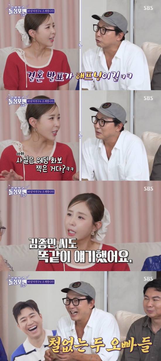 이를 들은 탁재훈은 "웨딩 잡지 표지 모델 한 거 아니냐. 해프닝이라는 말을 듣고 싶다"고 심술을 부렸고, 신지는 "사실은 그냥 웨딩 잡지 화보 찍은 거다? 여러분의 오해다? (하는 말을 듣고 싶은 거냐)"며 "김종민 씨도 똑같은 말을 했다"고 폭로했다.