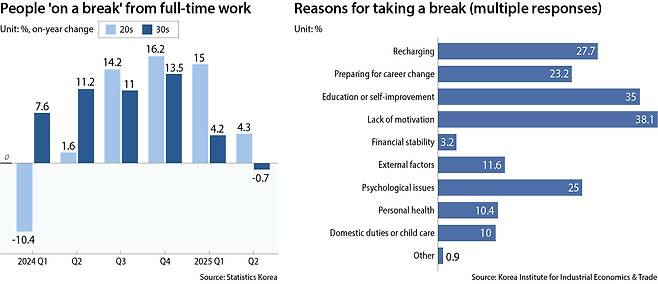 Roh is one of the fast-growing number of young people in the Korean labor market that has exited the work force, posing a significant challenge on Korea's shrinking and aging population. A total of 690,000 people in their 20s and 30s said they “were on a break” from work in June, accounting for 5.5 percent of the age group.