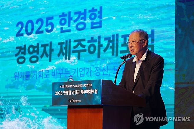 (서울=연합뉴스) 류진 한국경제인협회 회장이 16일 제주 롯데호텔에서 열린 '2025 한경협 CEO 제주하계포럼'에서 인사말을 하고 있다. 2025.7.16 [한국경제인협회 제공. 재판매 및 DB 금지]