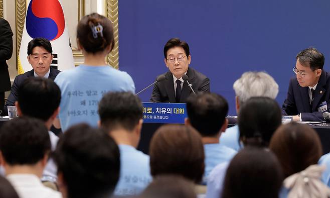 | 李 “정부 책임 다하지 못했다” 참사 사죄 이재명 대통령이 16일 오후 서울 종로구 청와대 영빈관에서 열린 ‘기억과 위로, 치유의 대화’에서 사회적 참사 유가족들의 이야기를 듣고 있다. 이 대통령은 “국정의 최고 책임자로서 국민의 생명과 안전을 지켜야 될 정부의 책임을 다하지 못했던 점과 그로 인해 많은 사람들이 유명을 달리한 점에 대해 공식적으로 정부를 대표해 사죄의 말씀을 드린다”고 말했다. 이 자리에는 세월호·이태원·제주항공 여객기·오송 지하차도 참사 유가족 등 200여명이 참석했다. 뉴시스 |