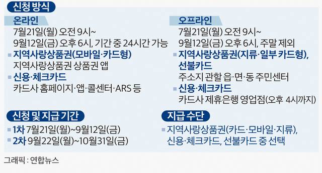 민생회복 소비쿠폰은 7월·9월 두차례 나눠 지급된다. 1차로 전 국민에게 1인당 15만∼45만원, 2차는 소득에 따라 국민의 90%에게 10만원을 추가로 준다는 구상이다. 소비쿠폰은 전 국민이 대상이지만 신청자에 한해 지급된다.