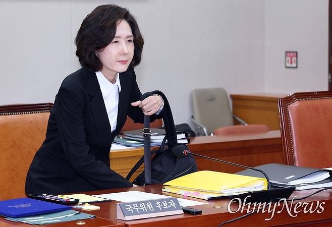 | ▲ 이진숙 사회부총리 겸 교육부 장관 후보자가 16일 서울 여의도 국회 교육위원회에서 열린 인사청문회에 출석해 자리에 앉고 있다. |