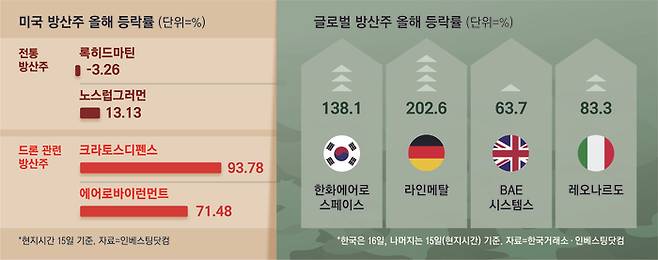 유례없는 글로벌 재무장 추세에서도 미국의 주요 방산주들은 상대적으로 부진한 성적을 냈다. 미국 최대 방산업체인 록히드마틴의 주가는 올 들어 지난 15일까지 3.26% 하락했다.