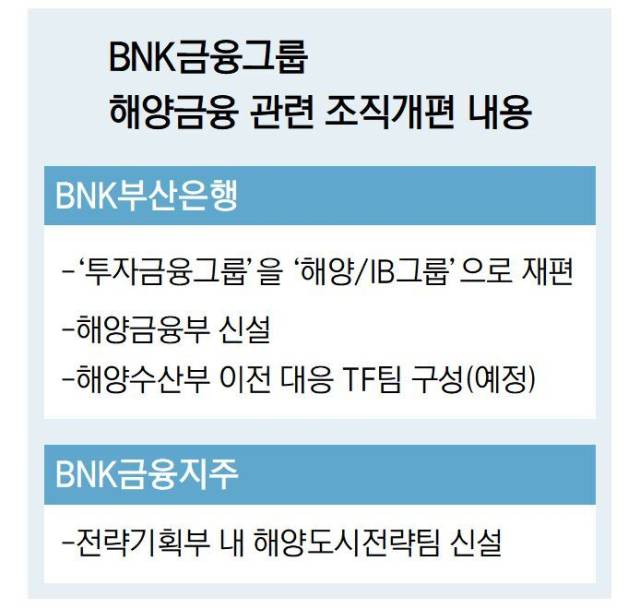 BNK금융그룹이 해양수산부 이전과 ‘해양수도 부산’에 맞춰 대대적인 조직 개편을 했다. 새 정부 기조에 따라 부울경이 해양 중심지로 바뀌고 해수부 이전에 따른 유관 기관 이전도 예상되는 만큼, 발 빠르게 해양 금융 부문 강화에 나선 것으로 풀이된다.