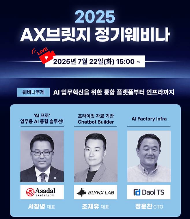 AI 공급기업 발표는 △AI 통합 업무 솔루션 'AI 프로'를 제공하는 아사달 △프라이빗 기반 챗봇 빌더 블링스 △IT 인프라 기업 다올TS가 참여한다.