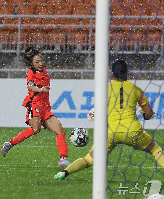 (수원=뉴스1) 장수영 기자 = 16일 오후 경기 수원시 팔달구 수원월드컵경기장에서 열린 2025 동아시아축구연맹(EAFF) E-1 챔피언십 여자부 대한민국과 대만의 경기, 전반전 대한민국 장슬기가 슛하고 있다. 2025.7.16/뉴스1