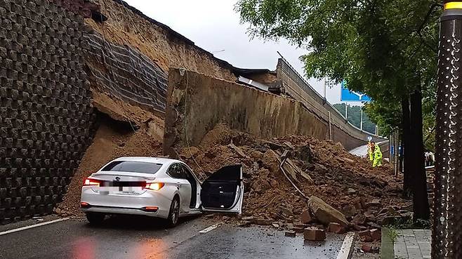 ▲ 무너진 옹벽에 깔린 차량