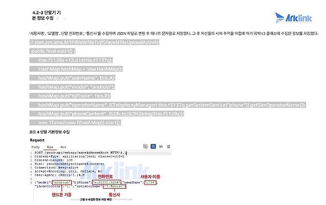 아크링크 R&D 센터 분석에 따르면, 'Mfile'은 안드로이드 환경에서 작동하는 악성 피싱 앱으로, 설치 즉시 사용자 단말의 △전화번호 △사용자명 △SMS 내역 △주소록 등을 무단 수집해 공격자의 명령제어(C&C) 서버로 전송한다. 특히 피해자의 백그라운드에서 지속 작동하며, 사진·동영상·오디오 등 스마트폰 내부 미디어 파일까지 수집하는 등 몸캠피싱에 악용될 수 있는 구조로 설계돼 있다.