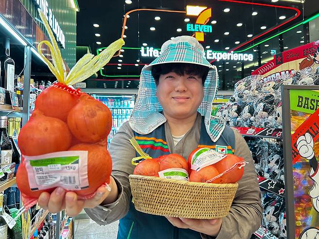 16일 세븐일레븐 모델이 경남 거창군에서 생산한 양파 꾸러미를 들어 보이고 있다. 세븐일레븐은 전국적으로 양파 출하량이 증가하면서 어려움을 겪는 지역농가와의 상생 프로젝트로 18일부터 거창 양파를 상품화해 본격 판매에 나선다.