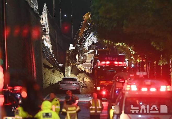 [오산=뉴시스] 김종택 기자 = 수도권 등 중부지역에 호우주의보가 발효된 16일 오후 경기 오산시 가장교차로 고가도로 옹벽이 무너져 소방관들이 매몰된 차량을 구조작업하고 있다. 2025.07.16. jtk@newsis.com