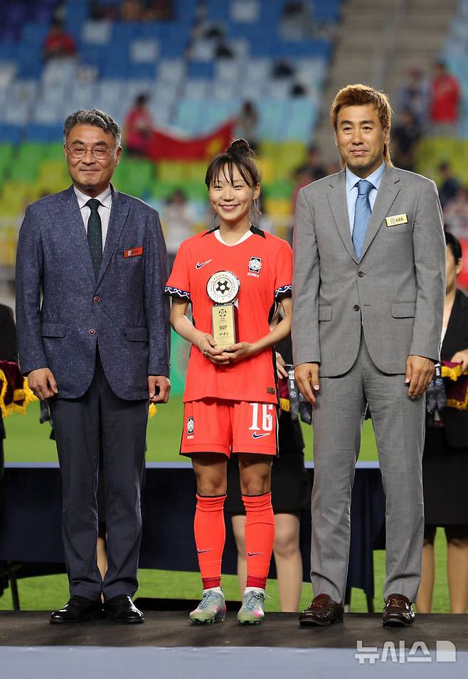 [수원=뉴시스] 김선웅 기자 = 16일 경기 수원시 수원월드컵경기장에서 열린 2025 동아시아축구연맹(EAFF) E-1 챔피언십(동아시안컵) 여자부 시상식에서 장슬기가 MVP를 수상하고 있다. 2025.07.16. mangusta@newsis.com