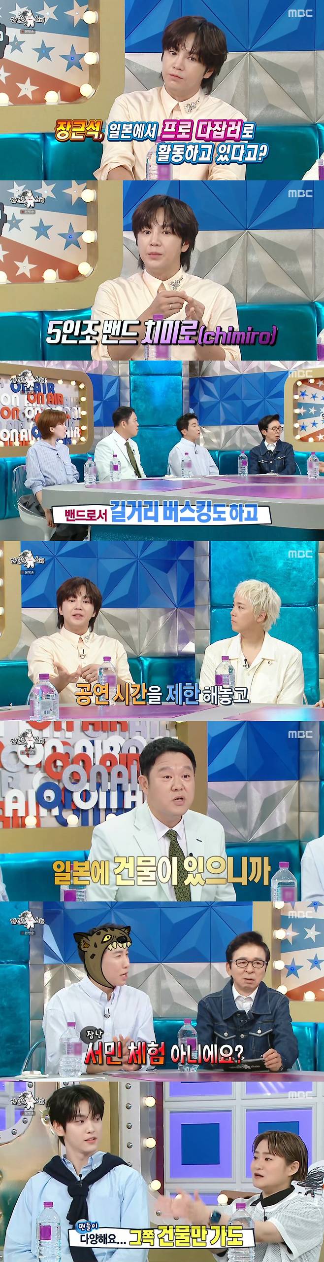또한 일본에서 프로다잡러로 활동 중이라는 장근석은 "배우 활동 외에 가수로서 다양한 유닛 활동을 하고 있다. 솔로 가수, EDM 유닛, 5인조 밴드로도 활동 중이다"며 "밴드로서 길거리 버스킹도 한다. 가방 열고 즉석 공연 후 그날 수입만큼만 식사를 한다"고 했다. 이를 들은 김구라는 "일본에 건물이 있으니까"라고 했고, 유세윤은 "서민체험 아니냐"고 해 웃음을 자아냈다.