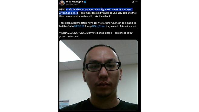 트리시아 매클로플린 미 국토안보부 차관보는 "베트남과 자메이카, 쿠바, 예멘, 라오스 국적의 남성들이 비행기로 에스와티니에 도착했다"고 밝혔습니다.