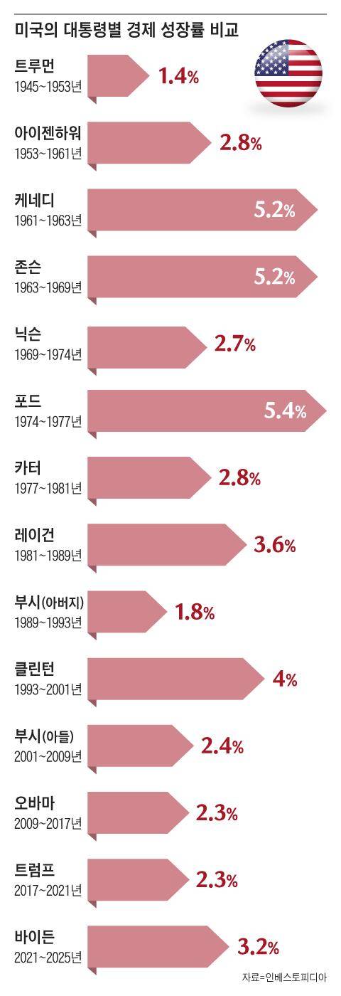 미국을 보자. 미국의 대통령 성장률은 우리와 달리 들쑥날쑥하다. 카터 때 2.8%로 주춤했던 성장률을 규제 완화와 감세를 내세운 ‘레이거노믹스’로 3.8%까지 올린 레이건이 있는가 하면, 재정 흑자 시대를 열며 평균 4% 성장을 달성한 클린턴 대통령이 있다.