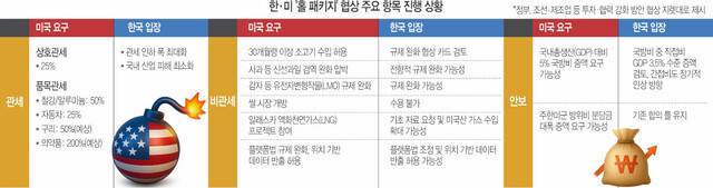 다만 현재 협상 대상 품목의 관할 정부부처 사이에 이견이 좁혀지지 않는 상태다. 농산물·디지털 분야 관련 정책을 주관하는 농림축산식품부와 국토교통부 등은 농산물 수입 확대와 디지털 규제 완화 등에 난색을 보이고 있다. 농식품부 관계자는 “농산물 시장 개방은 레드라인(한계선)을 지켜야 한다는 입장”이라고 말했다.