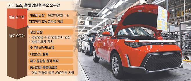 이 밖에도 기아 노조는 국민연금 수령 연한인 만 64세까지 정년 연장, 임금피크제 폐지, 정년퇴직자를 재고용하는 베테랑제도 폐지, 근로시간 일부를 노조활동에 할애하는 타임오프제 철폐, 해고 조합원 원직 복직, 대법원 판결에 따른 전 조합원 위로금 2000만원 지급, 장기근로자 우대 포상에 5년 근속·40년 근속 추가 등을 요구안에 담았다.