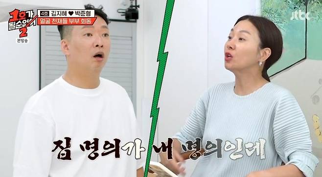 이어 김지혜는 "당신 번 것도 나한테 10원 한 장 안 주고 내 것만 쓴다. 당신이 생활비 준 게 1년이 안 됐다"라고 따졌고, 박준형은 "나도 할 말이 많다. 이 집을 혼자 샀냐"라고 발끈했다. 김지혜 역시 지지 않고 "명의가 내 명의인데 혼자 샀지. 그렇게 따지면 20년 동안 매해 얼마 벌었는지 나오는데 목록을 뽑아볼 것이냐. 구분해 줄까"라고 팽팽하게 대립했다. 팩트로 몰아붙이는 김지혜의 모습에 박준형은 갑작스럽게 눈빛이 흔들리는 모습으로 웃음을 자아냈다.
