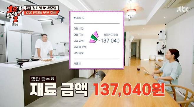 화가 난 김지혜는 박준형에게 "재료비에 얼마를 썼냐"라고 물었고, 13만 7천 원이라는 사실이 밝혀지자 황당해 했다. 이를 보던 패널들 마저 "이럴 거면 시켜 먹었지" "탕수육 10그릇 사 먹을 수 있다"며 혀를 내둘렀다.