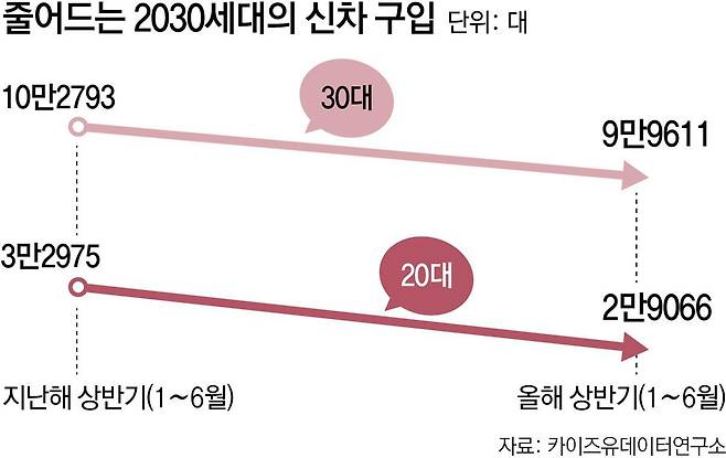 차가 정 필요해져도 신차 대신 초저가 중고차를 산다. B 씨는 최근 지방 외곽으로 순환근무를 하게 돼 500만 원짜리 중고 구형 쏘나타를 어쩔 수 없이 샀다. 그는 “지방 근무가 끝나면 차는 바로 처분할 것”이라고 했다. 카이즈유데이터연구소에 따르면 이 같은 20대의 지난달 중고차 구매 대수는 1만3322대로 올 5월(1만2913대)보다 3.2% 늘었다.