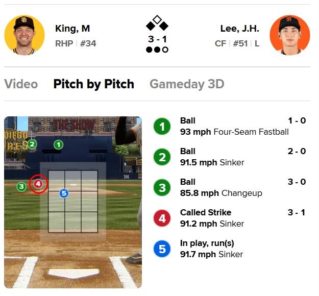 그러나 MLB.com 게임데이 확인 결과 해당 스위퍼는 스트라이크존을 벗어난 공이었다. 이후 이정후는 2구째 체인지업을 받아쳤으나 3루수 뜬공에 그치고 말았다.