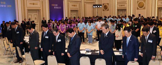 이재명 대통령(앞줄 왼쪽 두 번째)이 16일 청와대 영빈관에서 열린 '기억과 위로, 치유의 대화'에서 참석자들과 함께 묵념하고 있다. 이 대통령은 이날 세월호·이태원·오송지하차도·무안공항 참사 유가족들과 만나 "국민들의 생명과 안전을 지켜야 할 정부의 책임을 다하지 못했던 점에 대해 정부를 대표해 사죄의 말씀을 드린다"며 공식 사과했다. 왕태석 선임기자