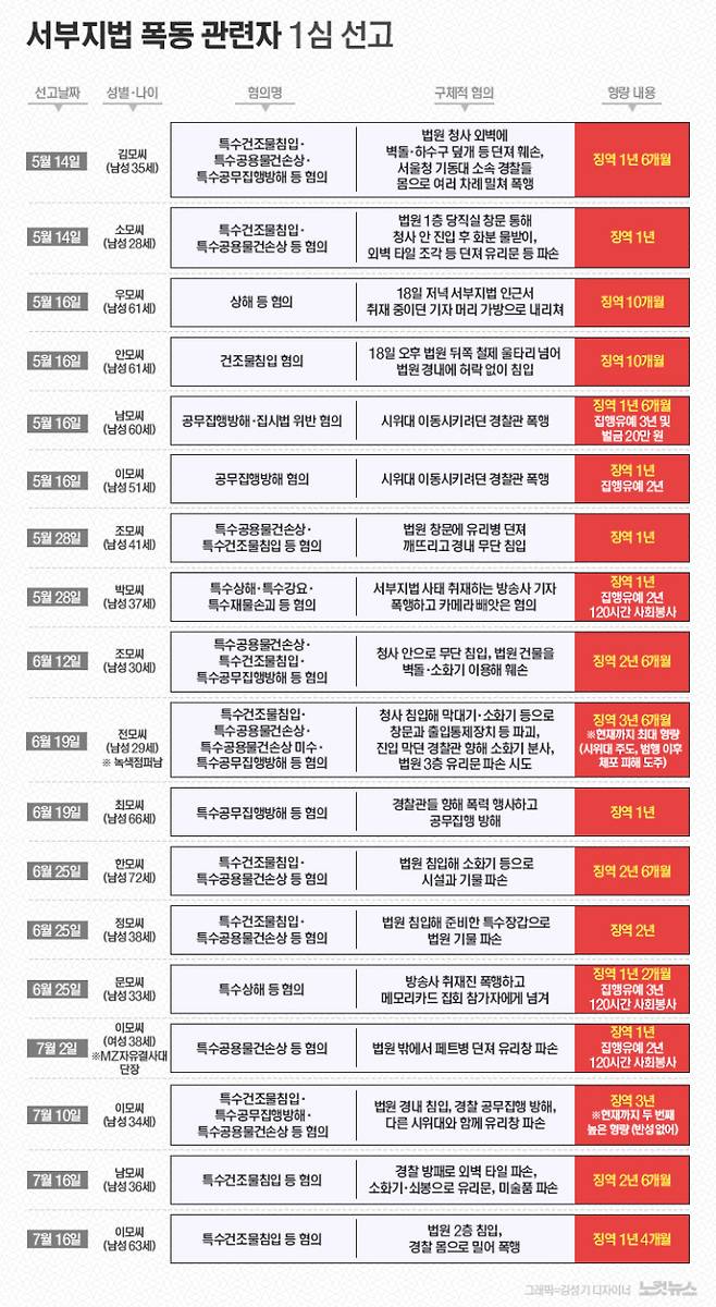 이 사건으로 기소된 이들은 최소 96명. 이미 일부 피고인들에게는 1심 판결이 선고됐다. 13명에게 징역형 실형이 내려졌고, 5명은 집행유예를 선고받았다. 최대 형량은 서부지법 청사에 침입해 막대기·소화기 등으로 창문과 출입통제장치 등을 파괴한, 이른바 '녹색점퍼남' 전모씨에게 내려진 징역 3년 6개월 형이다. 전씨가 난동에 앞장서며 다른 사람들을 선동했고 범행 후 체포를 피하기 위해 휴대전화를 끄고 도주한 것이 형량의 결정적 요인이었다.