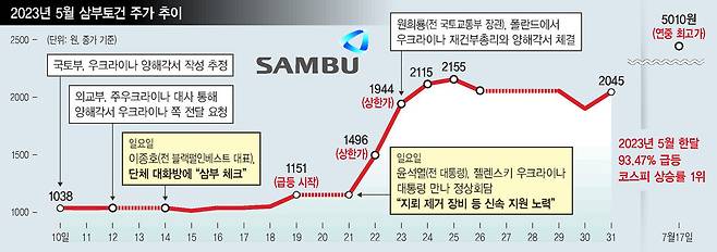 이종호 전 대표가 “삼부 내일 체크”라고 언급한 2023년 5월14일은 아직 삼부토건이 ‘우크라이나 재건주’로 주목받기 전이었다. 삼부토건 주가는 2023년 5월 초 1000원대에 머물렀지만, 원 전 장관이 폴란드에서 열린 ‘우크라이나 재건 포럼’에 참석했던 5월22일 이후 2배 급등했다. 삼부토건은 5월 한달 동안 93.47%나 주가를 올려 코스피 상승률 1위를 기록하기도 했다. 앞서 김건희 여사 관련 의혹을 수사하는 민중기 특별검사팀은 우크라이나 재건 사업을 진행할 것처럼 속여 시세를 조종한 혐의(자본시장법 위반)로 삼부토건 전현직 회장 등 4명의 구속영장을 청구했다. 특검팀이 산정한 이들의 부당이득은 369억원이다.이 전 대표가 “삼부 체크”라는 메시지를 보낸 시점이 삼부토건 주가조작의 시작점으로 꼽히는데, 국토부가 그 직전에 삼부토건을 ‘우크라 재건주’로 띄울 수 있는 업무협약 체결을 준비한 사실이 드러나면서 이 전 대표 등이 이를 사전에 알고 주가조작에 관여한 것 아니냐는 의혹이 더욱 짙어지고 있다.