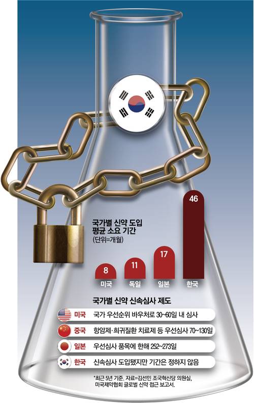 16일 한국글로벌의약산업협회에 따르면 신약이 새로 출시된 이후 1년 이내에 시장에 나오는 비율은 한국의 경우 5%(건강보험 적용 받지 않는 비급여 기준)에 불과하다. 경제협력개발기구(OECD) 국가 평균인 18%, 세계적으로 높은 수준인 일본 32%에 비해 턱없이 낮다. 식약처의 허가 심사 기간이 다른 나라에 비해 길기 때문이다.