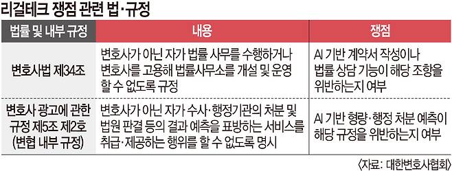 다만 대한변협 등 법조계의 반발이 이어질 전망이다. 대한변협은 로톡 사태 등에서 리걸테크 서비스 도입에 대한 반대 의사를 명확히 드러내 왔다. 변협은 변호사법과 내부 규정을 들어 변호사가 아닌 자가 법률 사무를 수행하는 행위와 수사·행정기관의 처분, 법원 판결 등의 결과 예측을 표방하는 서비스를 제공하는 행위를 금지했다. 이에 따라 로톡은 2021년 형량 예측 서비스를 종료했고, 넥서스AI와 대륙아주가 합작해 개발한 AI 챗봇 ‘AI대륙아주’도 지난해 10월 서비스를 중단한 상태다.