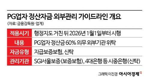 금감원이 업계와 논의한 뒤 행정예고 절차 등을 거쳐 오는 27일 확정할 예정인 가이드라인의 핵심은 모든 PG 업자들은 의무적으로 정산자금의 60%를 신탁, 지급보증보험 방식으로 외부기관에 맡겨야 한다는 것이다. 오프라인 회의는 전날 끝난 것으로 전해졌다. 정산자금은 PG사가 카드사·가맹점 간 거래할 때 중간에 보유하는 돈이다. PG사가 중간에서 멋대로 쓰면 지난해 발생한 티메프 사태 같은 사고가 터질 수 있기 때문에 감독 당국이 규제를 만들게 됐다. PG 업자 자금을 제대로 위탁관리하려면 PG사와 외부기관 모두 매일 정산(일정산) 잔액을 확인해 익영업일(다음 영업일)에 비율을 산정하는 시스템을 구축해야 한다.