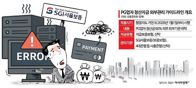 SGI서울보증 전산사고 때문에 정산금 60%를 외부기관에 의무적으로 맡겨야 하는 전자지급결제대행(PG) 업계가 혼란에 빠졌다. 금융감독당국이 이른바 '티메프 사태'로 불리는 티몬·위메프 대규모 정산 미지급 사태 재현을 막고자 내년부터 정산자금 외부기관 위탁 규정을 시행하기로 했는데, 외부기관인 서울보증에 문제가 생겨서다. 업계는 유예기간을 조금만 더 늘려달라고 요청하지만 감독 당국은 외부기관 때문에 규제 내용과 일정을 조정하기는 어렵다는 입장이다.