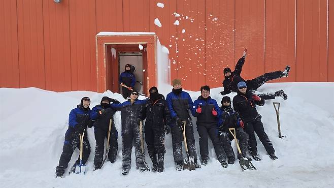 | ▲ 남극기지의 제설작업 눈이 많이 내려 주기적으로 전 대원이 제설작업을 해야 한다 |