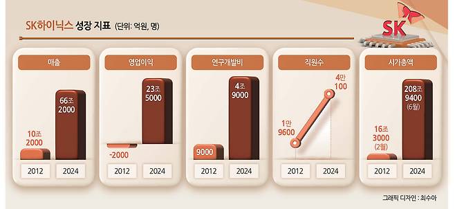 전신인 하이닉스반도체가 SK그룹의 품에 안겼던 2012년 2월 당시 시총은 16조3000억원에 불과했다. 그 해 매출은 10조원, 영업손실 2000억원을 낸 적자 기업이었다.