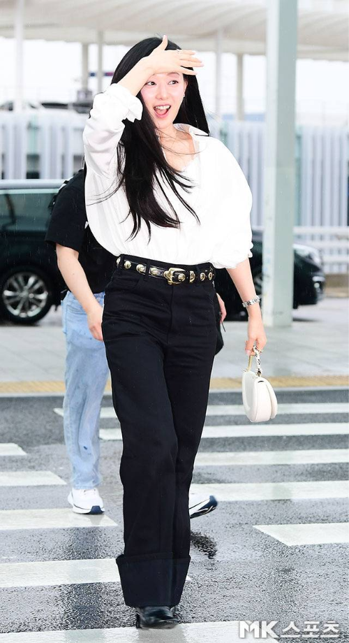 이날 김지원은 깔끔한 화이트 셔츠와 블랙 와이드 팬츠로 시선을 사로잡았다. 여기에 골드 포인트 벨트와 아이보리 하프문 백으로 단정하면서도 우아한 공항패션을 완성했다.