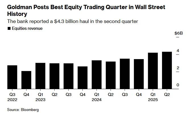 골드만삭스는 월가 기대를 뛰어넘는 2분기 실적을 공개했는데요. 매출은 전년 동기보다 15%, 이익은 22% 급증했습니다. 특히 주식 트레이딩에서 자체 분기 기록일 뿐 아니라 월가 사상 최대 분기 기록을 세웠습니다. 투자은행 부문 매출도 자문 수수료에 힘입어 26% 증가했습니다.
