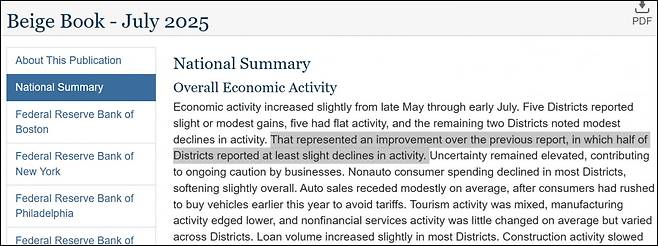 Fed가 발표한 베이지북도 내용이 나쁘지 않았습니다. 베이지북은 "5월 말부터 7월 초까지 경제 활동이 소폭 증가했다. 5개 지역은 소폭 또는 완만한 증가를 보고했고, 5개는 정체되었으며, 나머지 2개는 소폭 감소를 보였다. 이는 절반 이상에서 경제 활동이 소폭 감소했다고 보고했던 이전 보고서보다 개선된 것"이라고 썼습니다. 다만 "불확실성은 여전히 높았고, 이는 기업들의 지속적인 신중론에 영향을 미쳤다"라고 덧붙였습니다.