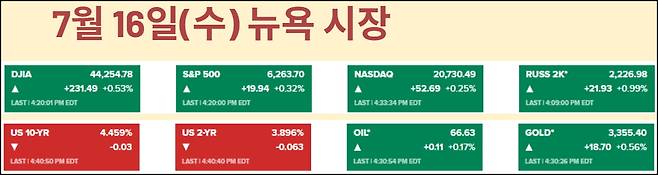 트럼프 대통령의 '파월 해임 드라마'가 방송된 날이었습니다. 갑자기 튀어나온 해임설에 시장은 혼란에 빠졌지만, 트럼프 대통령이 부인하면서 다시 정상을 되찾았습니다. 이 일을 제외하면 전반적으로 긍정적인 일들이 많았습니다. 뉴욕 증시가 오른 이유입니다. 6월 생산자물가(PPI)는 보합 수준으로 낮게 나왔고요. 골드만삭스 등 금융사들은 예상보다 좋은 실적을 줄이어 공개하고 있습니다. 금융사들은 미국 경제가 여전히 강하다고 증언하고 있습니다.