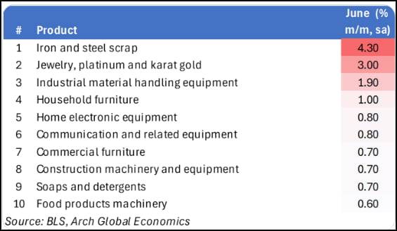PPI에서도 상품 분야에선 관세 영향이 감지됐습니다. (PPI는 수입품을 포함되지 않지만, 관세가 오르면 생산 단계 후반에서 간접 영향을 미칩니다) 6월에 가장 큰 PPI 상승률을 보인 품목 중 하나는 고철(iron and steel scrap)로 4.3% 올랐는데요. 이는 6월 초 철강·알루미늄 관세가 25%에서 50%로 뛴 탓일 가능성이 큽니다. 또 가정용 가구, 전자기기, 통신 장비 등 수입 의존도가 높은 품목들도 오름세가 두드러졌습니다. 이런 품목은 어제 CPI에서 많이 오른 것으로 나왔죠.