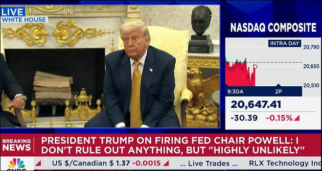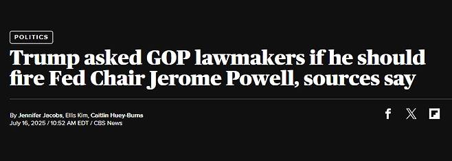 아침부터 CBS뉴스 등은 트럼프 대통령이 전날 공화당 의원들과의 비공개 간담회에서 파월 의장 해임에 대한 의견을 물었고, 의원들이 이에 찬성을 표했다고 보도했는데요. 애나 폴리나 루나(공화·플로리다) 하원의원은 전날 밤 X를 통해 "매우 진지한 소식통으로부터 파월이 해임된다는 얘기를 들었다. 99% 확신한다. 해임은 임박했다"라고 썼습니다.