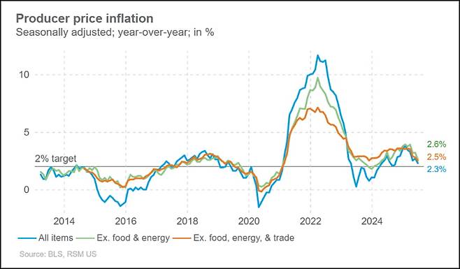 아치캐피털의 파커 로스 이코노미스트는 "6월 PPI에서도 디스인플레이션(물가 안정) 흐름이 지속한다는 점은 긍정적이지만, 동시에 관세 영향이 상품 물가를 밀어 올리는 초기 징후도 나타났다. 이런 관세 전가가 인플레이션을 재점화할 가능성을 배제할 수 없다. Fed는 당분간 금리를 유지한 채 지켜볼 가능성이 크다"라고 밝혔습니다.
